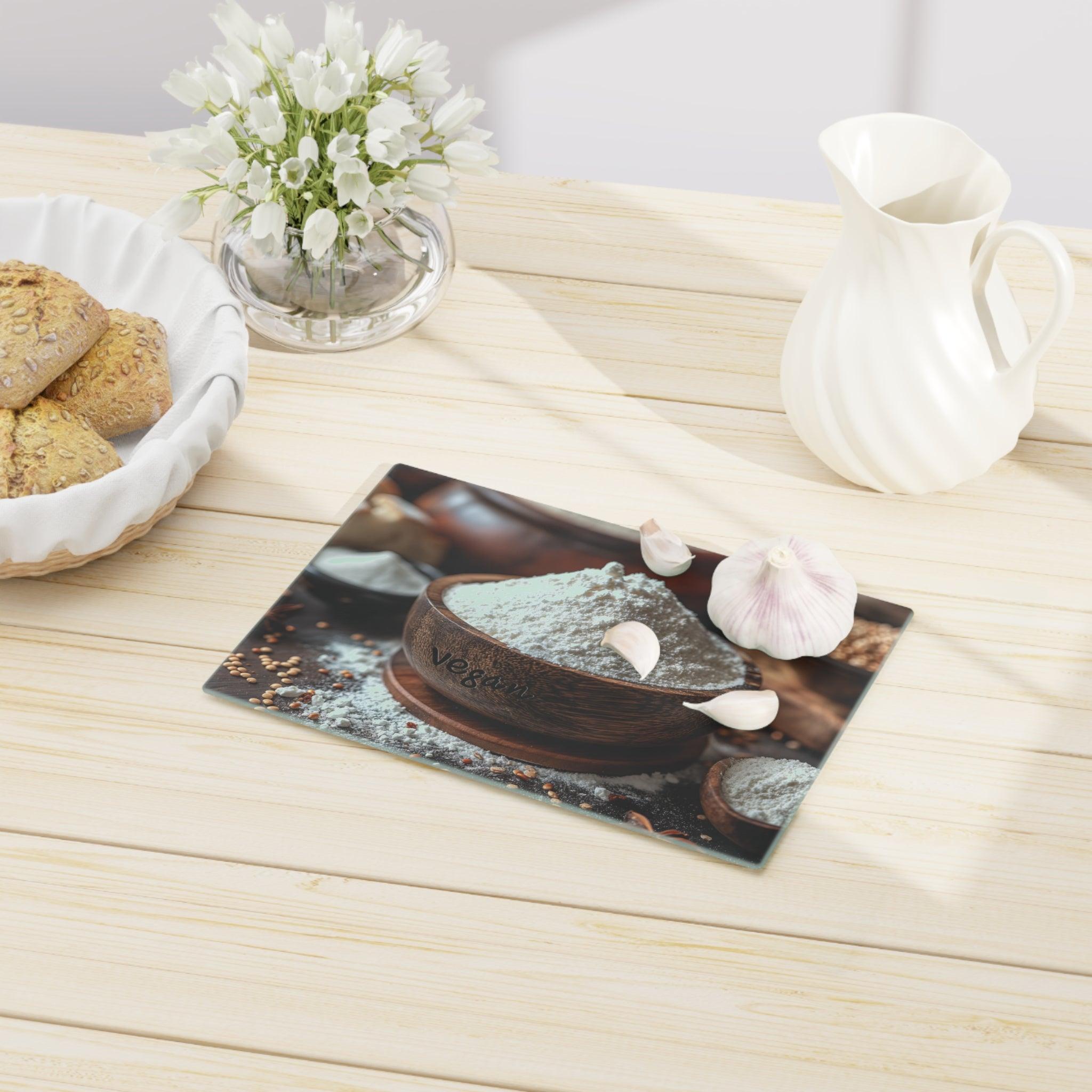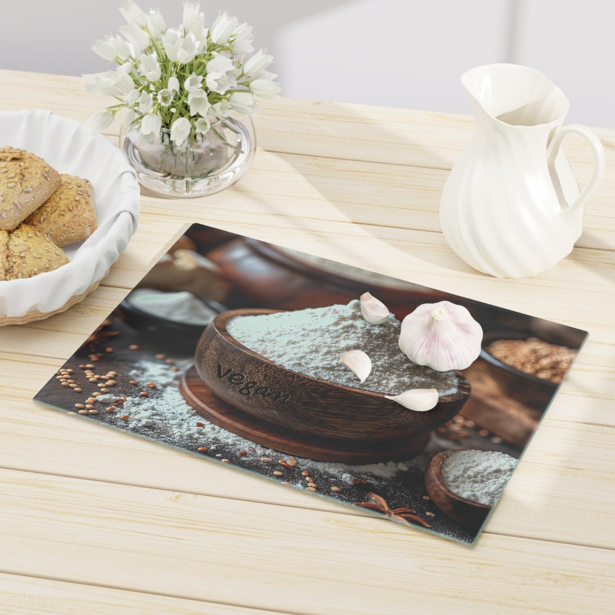 Add creativity to your kitchen with this vegan and plant-based themed tempered glass cutting board. Dishwasher-safe and delivers high re-usability as well as resilience. Designed with non-slip rubber dots keeping the board safely in place for all your chopping and slicing tasks. It’s the perfect personalized chopping block for all your slicing and chopping needs.